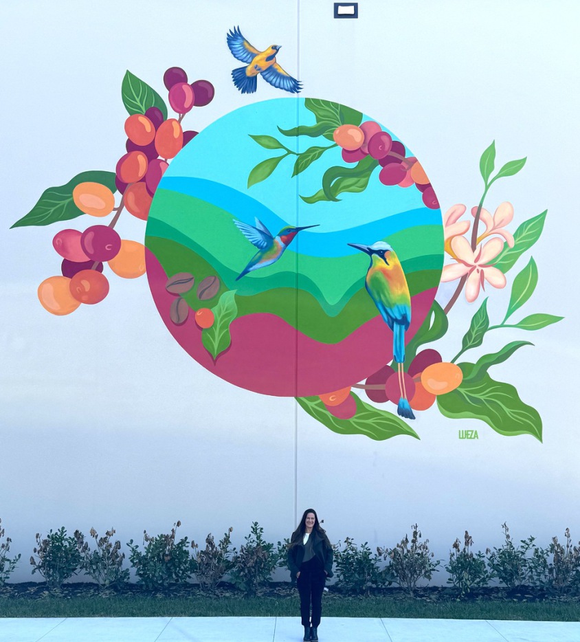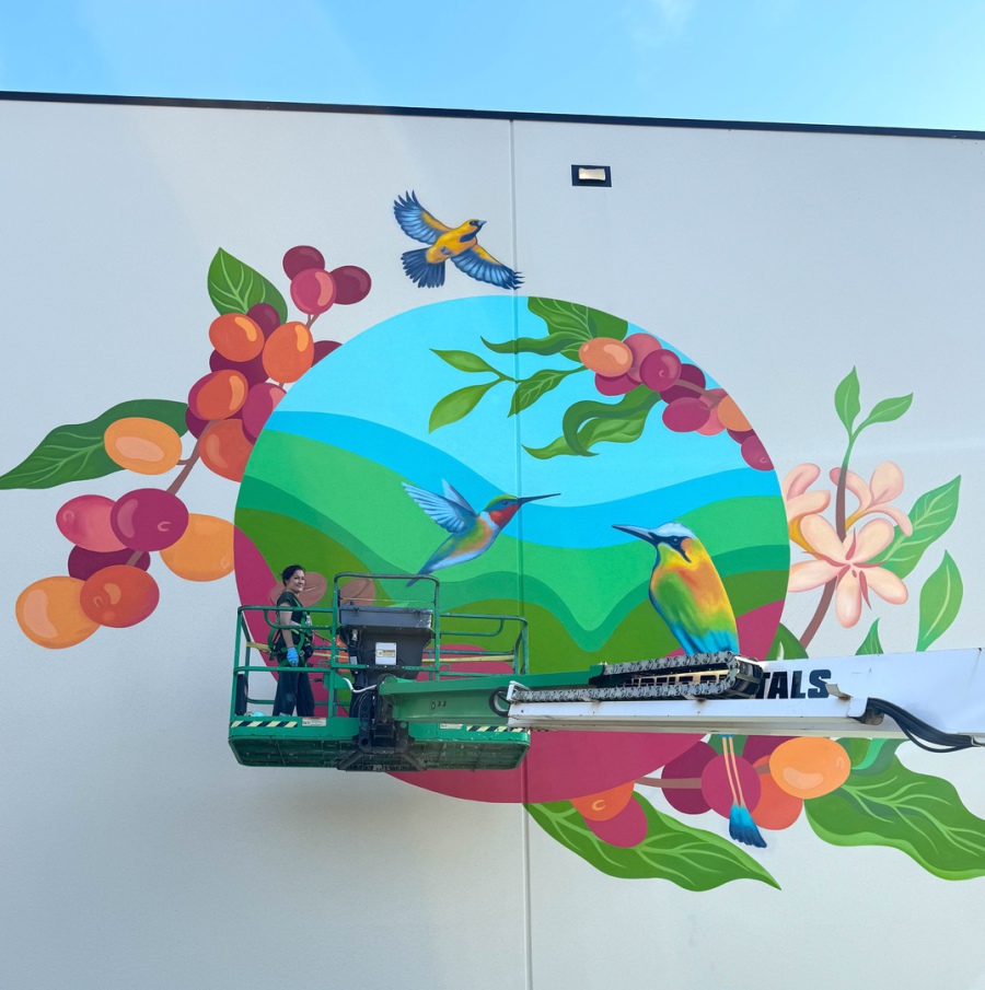 Mural inspired by the beauty of the coffee plantations and their colorful bird species.